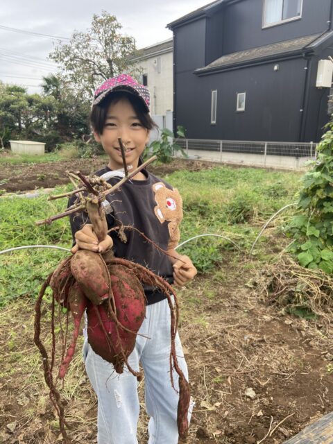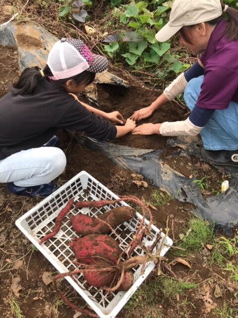 畑では、先に来ていた家族連れの子どもたちが土に手を入れ、芋を掘り出しています。「出た!」という声が次々と聞こえました。