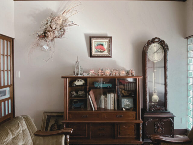 室内を拝見すると、オーナー様が大切にされているアンティークの振り子時計やドライフラワーが、私たちが手を入れた漆喰壁や古い木部と見事に調和していました。その光景を目にし、オーナー様の暮らしと建築がしっくりと馴染んでいるのが肌で感じられ、設計者として嬉しい限りでした。